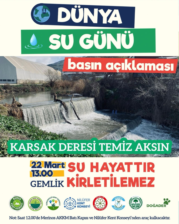 Dünya su günü olan 22 Mart’ta Karsak Deresi’nin yanında basın açıklamasında bulunacaklarını ifade eden Sedat Akkuş, sözlerini şöyle bitirdi: “Bursa Kent Konseyi Çevre Meclisi, Osmangazi Kent Konseyi, Nilüfer Kent Konseyi, Mudanya Kent Konseyi, Karacabey Kent Konseyi, DOĞADER ile birlikte saat 13.00’da yapacağımız basın açıklamasına tüm doğaseverleri bekliyoruz. Artık Karsak Deresi temiz aksın”