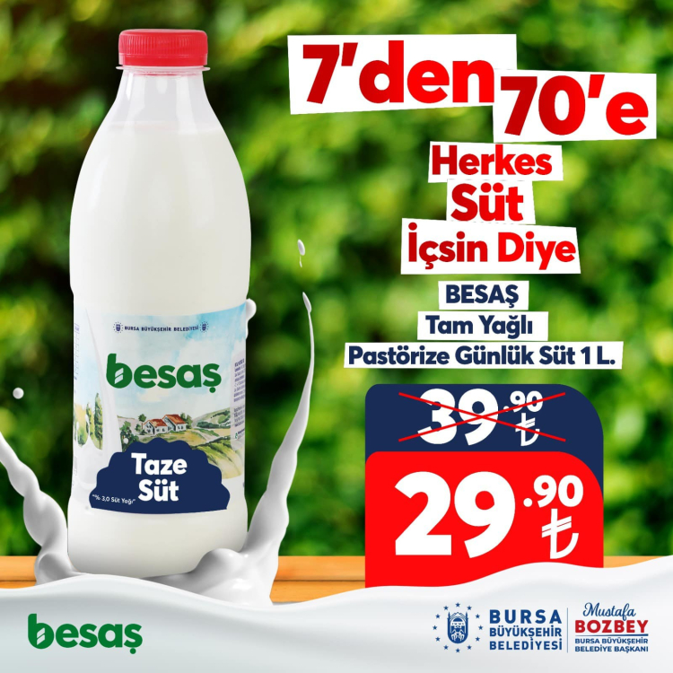 Bursa Büyükşehir Belediyesi, bir taraftan çiftçinin ürününü değerlendirirken, diğer taraftan da Bursalıları sağlıklı gıda ile buluşturuyor. Bursa Büyükşehir Belediyesi iştiraklerinden BESAŞ, Orhaneli, Harmancık, Keles ve Büyükorhan ilçelerindeki hayvancılığı desteklemek adına süt alımına devam ediyor. Hastalıktan ari ruhsatlı işletmelerden düzenli olarak alınan sütler BESAŞ Keles Süt Tesisleri'nde işleniyor. Böylece kaliteli ve sağlıklı pastörize günlük süt, ayran, yoğurt, süzme yoğurt, klasik beyaz peynir, gurme kaşar, tost peyniri, krem peynir, lor, süt kreması üretilerek Bursalıların sofralarına ulaştırılıyor. ‘Sağlıklı beslenmek herkesin hakkı’ diyerek hareket eden BESAŞ, tüketiciye kaliteli ürünü daha uygun fiyata ulaştırmak için 1 litre içime hazır taze sütün 39,90 TL olan fiyatında 10 TL’lik indirim gerçekleştirilerek 29.90 TL’den satışa sunmaya başladı.