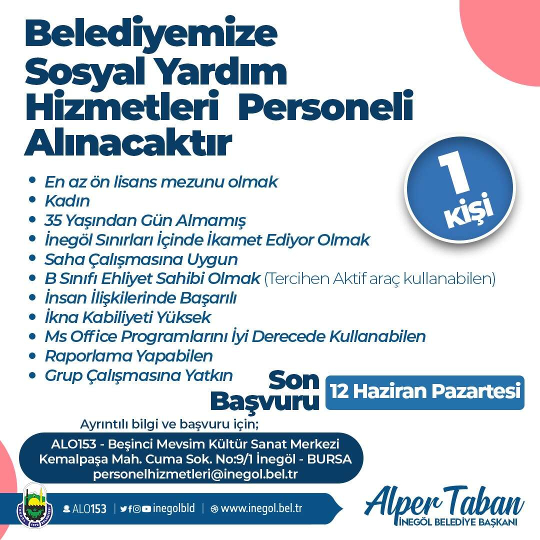 İnegöl Belediyesi, en az ön lisans mezunu olmak üzere 35 yaşını aşmamış, kadın sosyal yardım hizmetleri personeli alımı yapılacağını duyurdu. Son başvuru 12 Haziran 2023 olarak açıklandı.