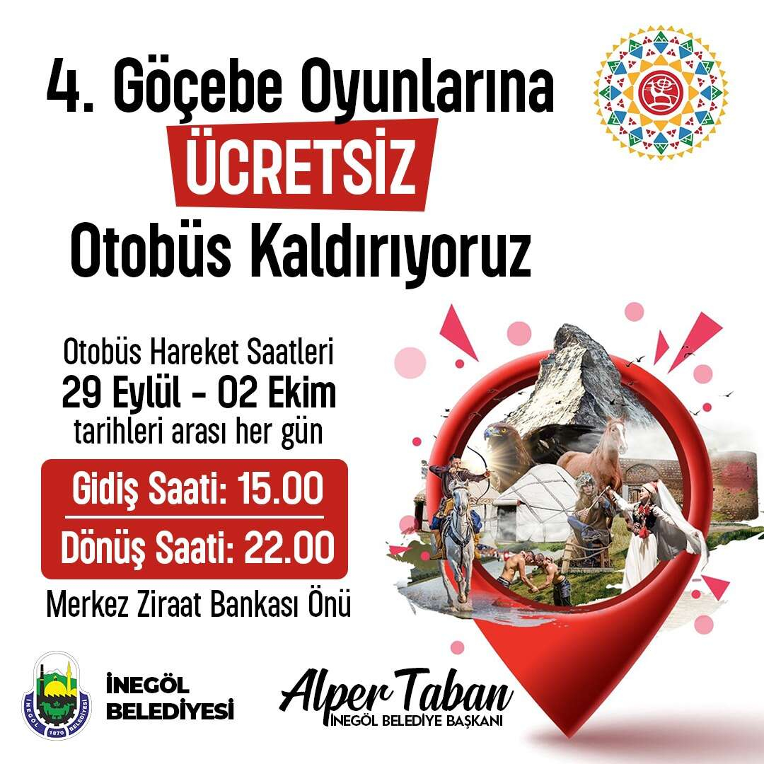 Konuya ilişkin bir açıklama yapan İnegöl Belediye Başkanı Alper Taban, “Bursa’mız bu yıl 2022 Türk Dünyası Kültür Başkenti seçildi. Bizler için önemli bir yıl. Aynı zamanda 29 Eylül-02 Ekim tarihleri arasında da yine Bursa’mız dünya çağında bir organizasyona ev sahipliği yapacak. İznik’te 102 ülkeden 3 binin üzerinde sporcunun katılacağı 4. Dünya Göçebe Oyunları gerçekleştirilecek. Bizler de şehrimiz ve ülkemiz adına önemli bir organizasyon olan ve aynı zamanda vatandaşlarımızın da ilgisini çekecek bu anlamlı organizasyon için ulaşım konusunda destek vereceğiz. 29 Eylül Perşembe gününden başlamak üzere 4 gün boyunca İnegöl’den İznik’e 4. Dünya Göçebe Oyunları için ücretsiz otobüs kaldıracağız. Her gün 15.00’da Ziraat Bankası önünden kalkacak araçlarımız, akşam 22.00’da da oradan geri dönecek. Herhangi bir sınırlama veya kontenjan yok. Bu vesileyle ben tüm vatandaşlarımızı İznik’te yapılacak 4. Dünya Göçebe Oyunlarına davet ediyorum. Aynı zamanda orada İnegöl Belediye’mizin de standı olacak. Standımıza da beklediğimizi ifade etmek istiyorum” dedi.