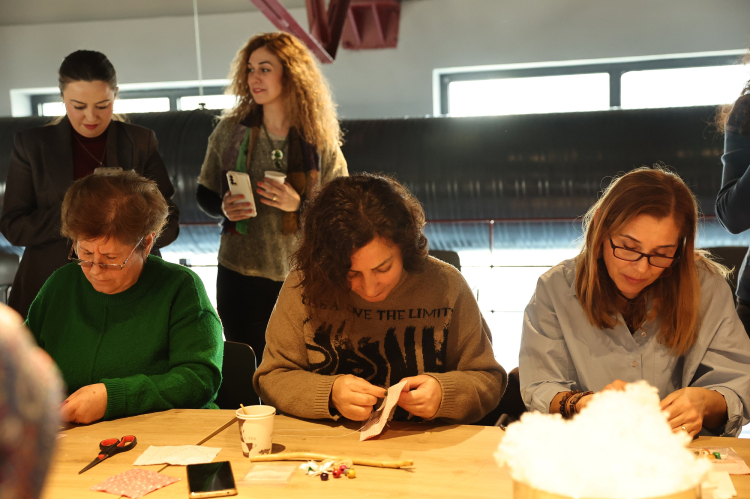Pancar Deposu’nda gerçekleştirilen atölyeye katılan kadınlar, Gülçin Çalık eğitmenliğinde kapı süsleri tasarladı. Katılımcılar, el emeği ürünlerine son şeklini vermek için özenle çalışırken, aynı zamanda keyifli vakit geçirdi.