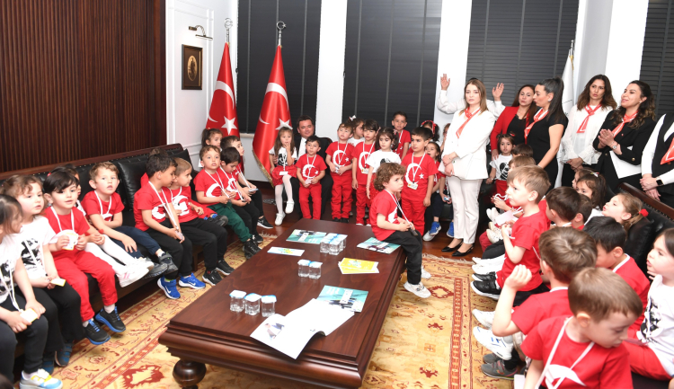 Başkan Aydın, 23 Nisan Ulusal Egemenlik ve Çocuk Bayramı kutlamaları kapsamında gerçekleşen ziyarette, minik öğrencileri makamında ağırladı. 23 Nisan için yaptıkları resimleri de yanlarında getiren çocuklar, Başkan Aydın’a sarılarak sevgilerini gösterdi. Kendisini ziyarete gelen çocukların her biriyle tek tek ilgilenen ve resimlerini inceleyen Başkan Aydın, minik öğrenciler ile birlikte şarkılar söyleyerek, bayramlarını kutladı. Başkan Aydın daha sonra makam koltuğunu Ayça Azak Gündüz Bakımevi ve Çocuk Kreşi öğrencisi Amine Berra Yılmaz’a devretti.