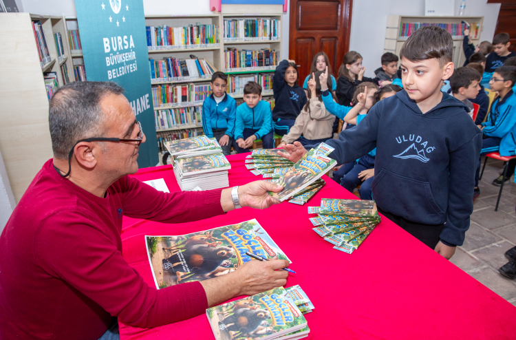Başta çocuklar olmak üzere her yaştan Bursalıya kitap okuma alışkanlığı kazandırmaya yönelik çalışmalarını sürdüren Bursa Büyükşehir Belediyesi Kütüphaneler Şube Müdürlüğü, farklı yaş gruplarındaki okurlarını yazarlarla buluşturmaya devam ediyor. Son olarak Lala Şahin Paşa Çocuk Kütüphanesi’nde düzenlenen etkinlikte, ‘Göçler Zamanı’ adlı kitabın yazarı H. Suat Delibaş, İbni Sina İlkokulu öğrencileriyle bir araya geldi. Çocuklara kitap yazma sürecini anlatan Yazar H. Suat Delibaş, kitabında daha çok insanların paylaşarak, birbirini ötekileştirmeden ve savaşmadan yaşamasını anlatmak istediğini dile getirdi. Delibaş, söyleşinin ardından ‘Göçler Zamanı’ adlı kitabını öğrenciler için imzaladı.