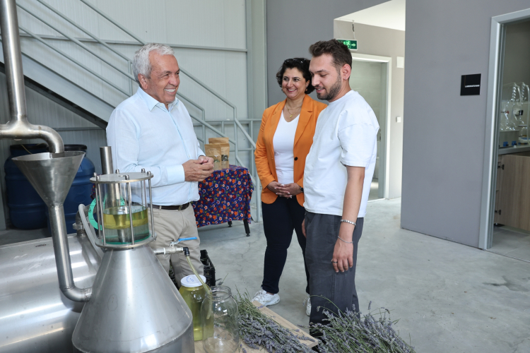 Hasadın ardından Nilüfer Tıbbi ve Aromatik Bitki İşleme Tesisi’ni de ziyaret eden Başkan Şadi Özdemir, lavantanın distilasyon süreci ve elde edilen ham maddelerden üretilen ürünler hakkında yetkililerden bilgi aldı.
