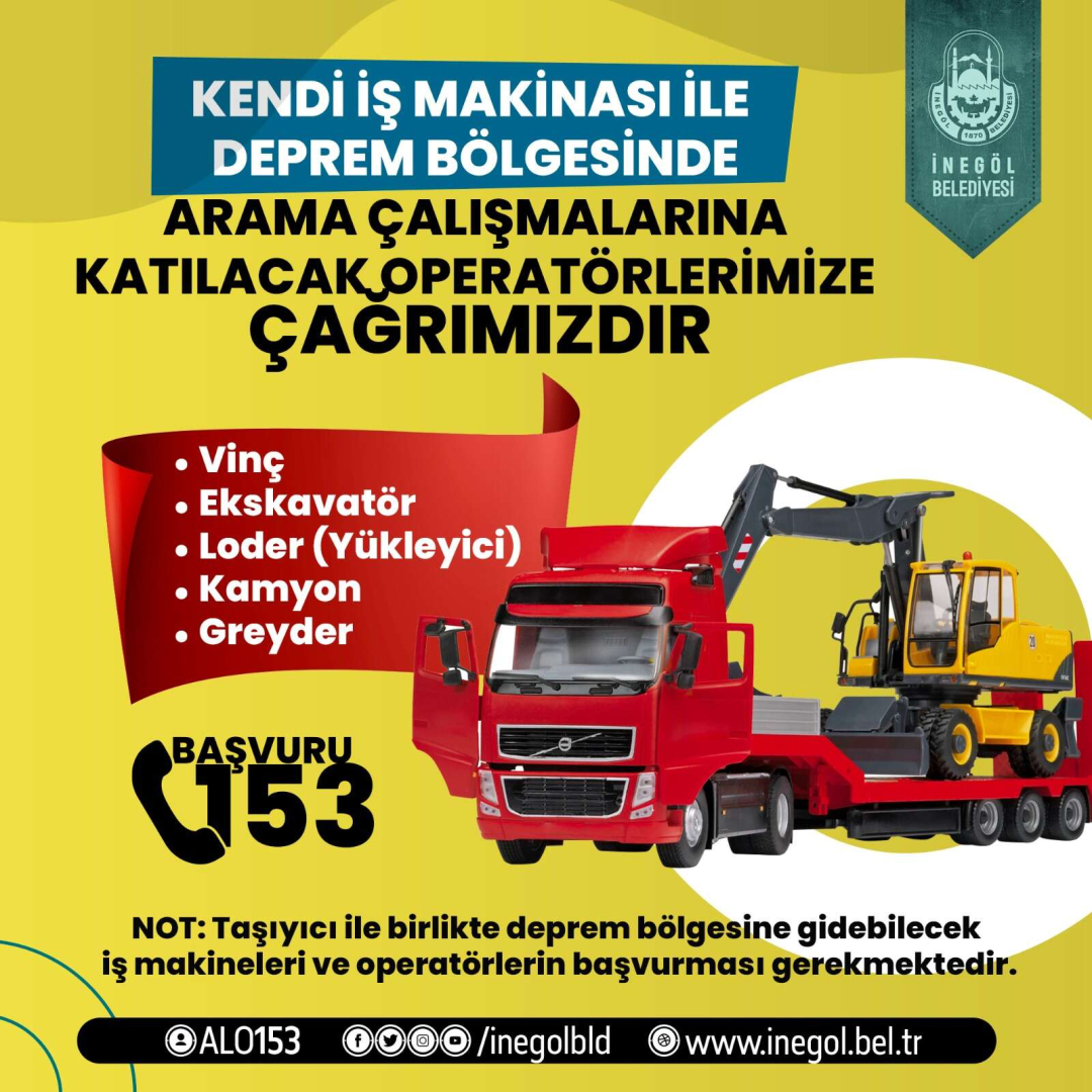 Kahramanmaraş’ta yaşanan deprem sonrası 10 ilde arama kurtarma çalışmaları sürüyor. Bu kapsamda İnegöl Belediyesi çalışmalara katılabilecek operatörlere ve iş makinası sahiplerine çağrıda bulundu. Yapılan açıklamada; vinç, ekskavatör, loder (yükleyici), kamyon ve greyder için kendi iş makinası ile deprem bölgesinde AFAD koordinasyonunda arama kurtarma çalışmalarına katılabilecek, aynı zamanda taşıyıcı ile birlikte deprem bölgesine gitme imkanı bulunan iş makinası ve operatörlerin 153 hatları üzerinden Çözüm Merkeine başvurmaları istendi.