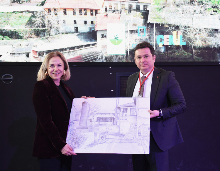 Osmangazi Belediye Başkanı Erkan Aydın, konuşmasının sonunda Turgut Yılmazipek’in kızı Hülya Yılmazipek’e fabrikanın karakalem olarak çizilmiş resmini hediye etti.