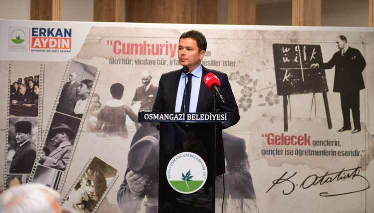 Saygı duruşu ve İstiklal Marşı’nın ardından sözlerine başlamadan önce tüm eğitimcilerin 24 Kasım Öğretmenler Günü’nü içtenlikle kutlayan Osmangazi Belediye Başkanı Erkan Aydın, “Sadece bir gün değil, her gün onların günü olsun. Öğretmenlerimiz, hepimiz için hayatımızda unutamadığımız izler bırakan, anlar bırakan ve kaç yaşına gelirsek gelelim hatıralarımız olan çok güzel insanlar.” dedi.