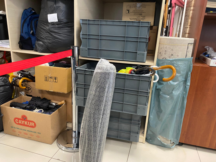 Osmangazi Metro İstasyonu'nda bulunan Kayıp Eşya Bürosu'nda saklanan eşyalar, düzgün bir şekilde istiflenerek başvuru yapan vatandaşlara teslim ediliyor. Unutulan eşyalar arasında işitme cihazları, scooter, koltuk değnekleri, baston, resim tuvalleri, anahtarlıklar, kolyeler, saatler, cep telefonları, dizüstü bilgisayarlar, tabletler ve halı gibi birçok eşya bulunuyor.