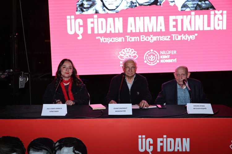 Nilüfer Belediyesi Halk Evi önünden sloganlar ve marşlarla birlikte Üç Fidan Gençlik Parkı’na yürüyüşle başlayan anma etkinliği, Bursa Gençlik Dayanışması adına Dilan Karabatak ve Ebrar Gül’ün yaptığı konuşmayla başladı. “Üç Fidan”ın emperyalizme karşı mücadelesinin Türk gençliğine açtığı yolu anlatan Karabatak ve Gül, bu mücadelenin günümüzde de sürdüğünü belirttiler.