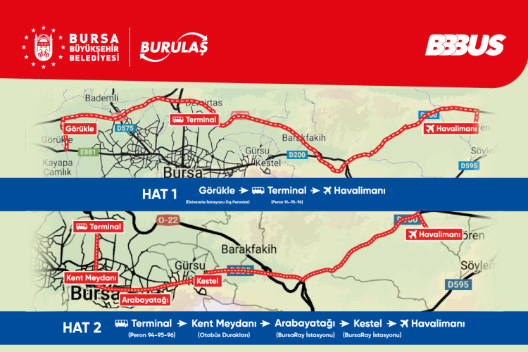 Her gün toplu taşıma araçlarında yüz binlerce vatandaşı taşıyan Büyükşehir Belediyesi iştiraklerinden BURULAŞ, Yenişehir Havalimanı'na 12 Haziran Perşembe gününden itibaren BBBUS otobüs seferlerini başlattı. Yeni sefer hatları, Görükle-Terminal-Yenişehir Havalimanı ile Terminal-Kent Meydanı-Arabayatağı-Kestel-Yenişehir Havalimanı şeklinde olacak. Uygulamada, BursaKart kullanımı geçerli olmayacak. Bilet almak, sefer saatlerini öğrenmek ve detaylı bilgi için https://bus.burulas.com.tr/ adresi ziyaret edilebilir.