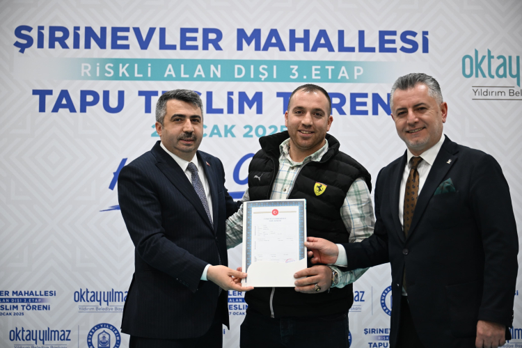 Naim Süleymanoğlu Spor Kompleksi’nde düzenlenen Şirinevler Mahallesi 3. Etap Tapu Teslim Töreni’ne Yıldırım Belediye Başkanı Oktay Yılmaz, Büyükşehir Belediyesi Başkan Vekili Recep Çohan, AK Parti İl Başkan Vekili Cem Kürşad Hasanoğlu, AK Parti İlçe Başkanı İrfan Akkaya ve vatandaşlar katıldı.