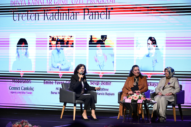 ‘Hayatları Değişen Kadınlar’ belgesel gösterimi ile başlayan program, Üreten Kadınlar Paneli ile devam etti. Moderatörlüğünü Gazeteci Cennet Cankılıç’ın üstlendiği panelde, AK Parti Bursa Milletvekili Emine Yavuz Gözgeç, Çağdaş Bölme Yönetim Kurulu Başkanı Sevgi Demir ve Zeyniler Çalıkuşu Kadınlar Tarımsal Kalkınma Kooperatifi Yönetim Kurulu Başkanı Mahinur Özkaya Makar konuşmacı olarak yer aldı. Alanında başarıyla varlığını sürdüren konuşmacılar, bu süreçteki arayışlarını ve mücadelelerini katılımcılarla paylaşarak, kadınların üretime ve topluma katkısına önemini vurguladı.