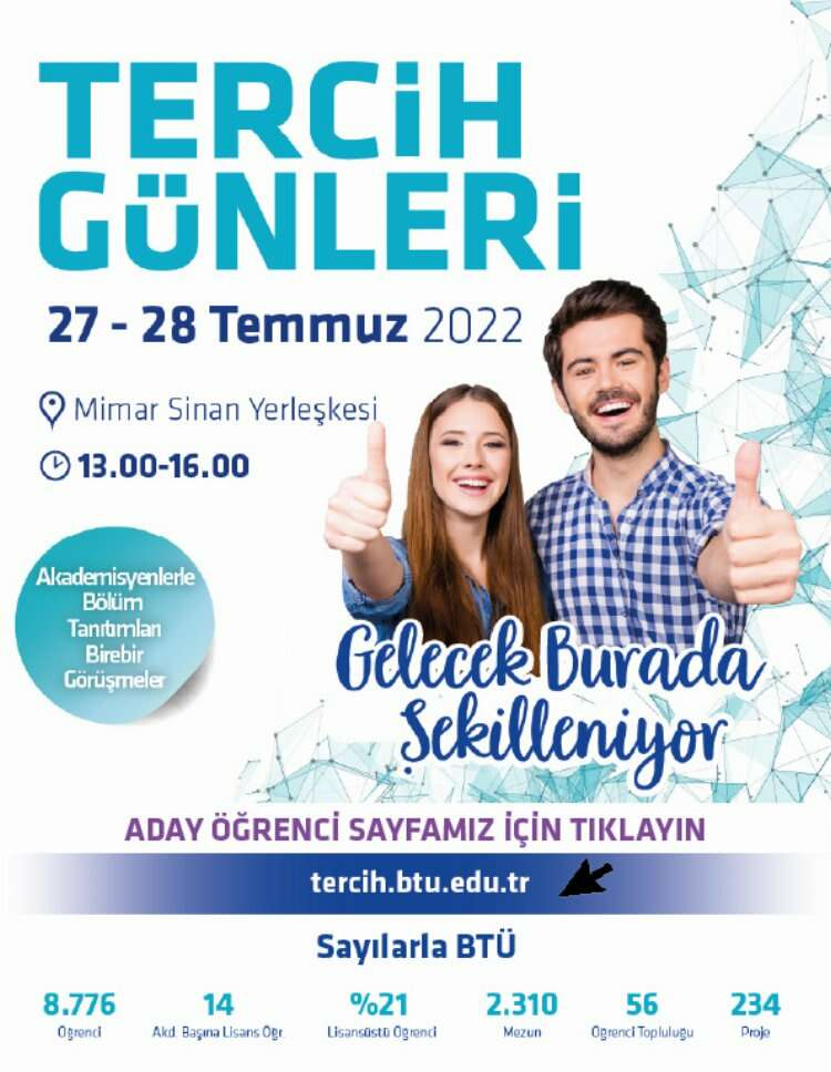Öğrencilerin karar aşamalarını kolaylaştırabilmek adına Bursa Teknik Üniversitesi (BTÜ) İletişim Ofisi her yıl olduğu gibi bu yıl da “BTÜ Tercih Günleri”nde üniversite adayları ile bir araya gelmek için hazırlıklarını tamamladı. Geleneksel hale gelen ve BTÜ Mimar Sinan Yerleşkesi’nde düzenlenecek “BTÜ Tercih Günleri” kapsamında aday öğrenci ve yakınları tüm bölümlerin yer aldığı stantlarda bölüm akademisyenleri ile birebir görüşerek yerleşkeler, eğitim sistemi, beslenme, kültür-sanat, spor, kütüphane, laboratuvarlar, İşletmede Mesleki Eğitim Programı, öğrenci değişim programları gibi konularda detaylı bilgi edinebilecek. İki gün sürecek olan “BTÜ Tercih Günleri” 27-28 Ağustos tarihlerinde 13.00 – 16.00 saatleri arasında gerçekleştirilecek.