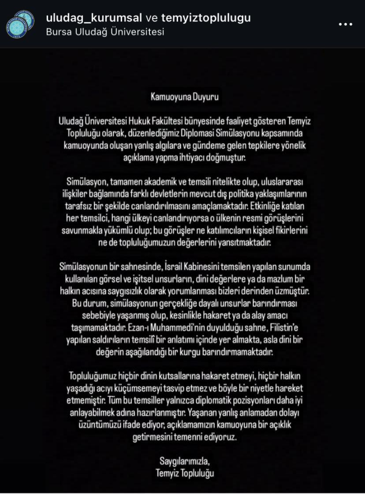 Üniversitemiz Hukuk Fakültesi Temyiz Topluluğu öğrencilerinin düzenlediği Diplomasi Simülasyonu programı kapsamında gerçekleştirilen canlandırma anlarındaki görüntülerin bağlamından koparılarak sosyal medyada ağır ifadelerle dolaşıma girdiğini üzülerek takip ediyoruz. Simülasyonun bir sahnesinde, israil kabinesini temsilen yapılan sunumda gerçekliğe dayalı unsurlar barındırması sebebiyle Ezan-ı Muhammedi'nin duyulduğu esnada Filistin’de soykırım yaparken aşağılık bir şekilde umursamaz davranışlar sergileyen israillilerin tavırları yansıtılmaya çalışılmıştır. Bursa Uludağ Üniversitesi, Filistin Devletinin ve halkının her zaman yanında olmuştur. Bundan sonra da olmaya devam edecektir. Saygılarımızla, Bursa Uludağ Üniversitesi Rektörlüğü