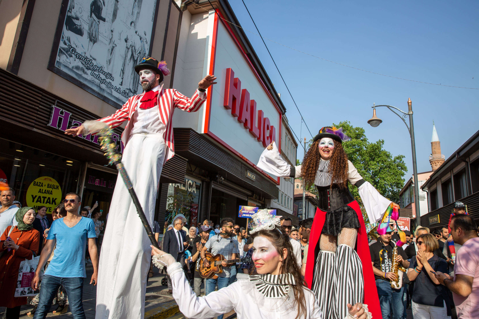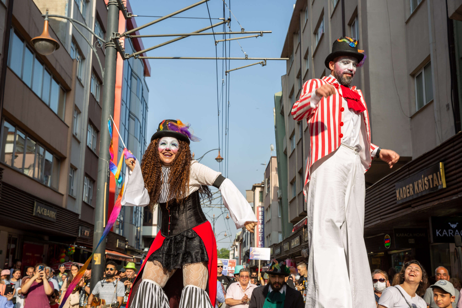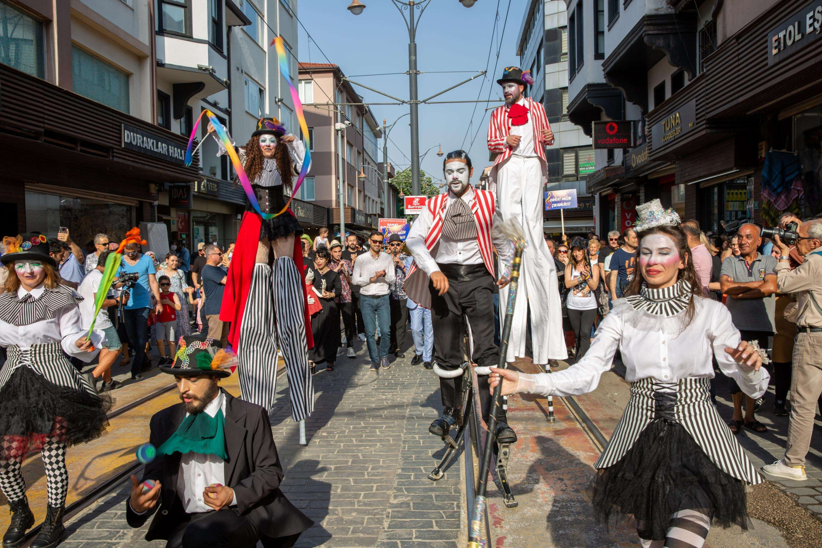 Müzisyenler, pandomim sanatçıları, tiyatrocular, uzun bacaklar ve palyaçolar eşliğinde Cumhuriyet Caddesi’nde yapılan yürüyüş renkli görüntülere sahne oldu. Vatandaşlar da şenlik havasındaki yürüyüşte alkışlarıyla sanatçılara destek verdi.