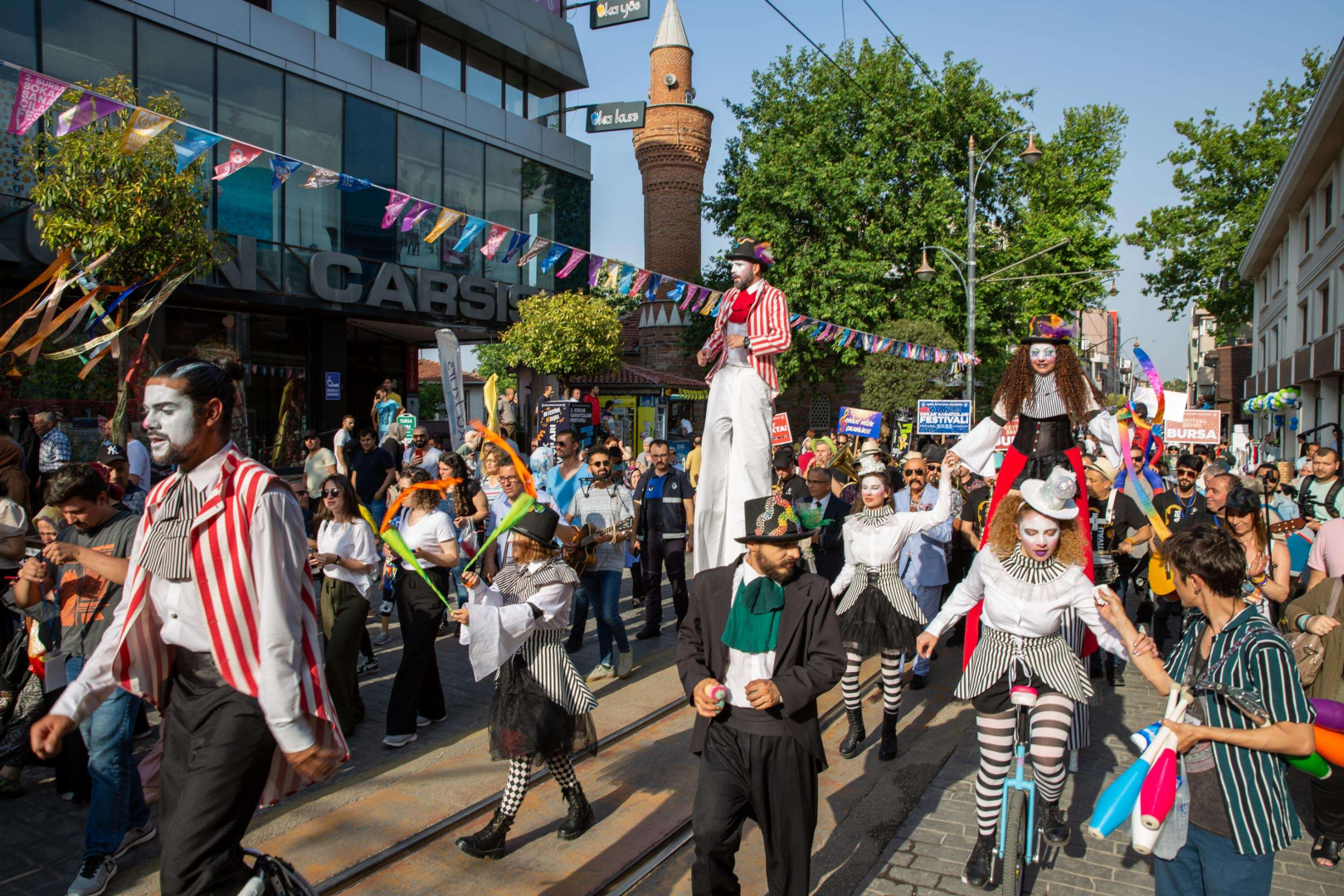 Bursa Büyükşehir Belediyesi tarafından bu yıl ikincisi düzenlenen Uluslararası Sokak Sanatçıları Festivali, renkli kortejle başladı.