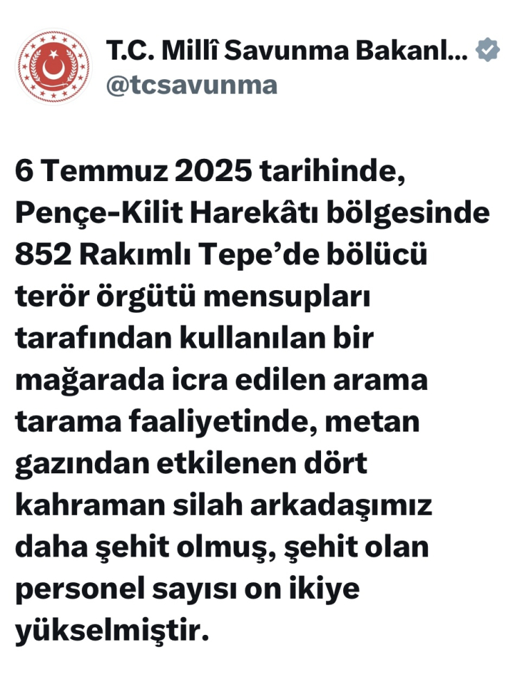Milli Savunma Bakanlığı, 6 Temmuz 2025 tarihinde Pençe-Kilit Harekâtı bölgesinde, 852 Rakımlı Tepe’de teröristler tarafından kullanılan bir mağarada gerçekleştirilen arama-tarama faaliyetinde metan gazından etkilenen 7 askerin daha şehit olduğunu duyurdu. Böylece bölgedeki toplam şehit sayısı 12’ye yükseldi. Bakanlık, olayın tüm ülkeyi derin bir acı ve üzüntüye boğduğunu ifade etti.
