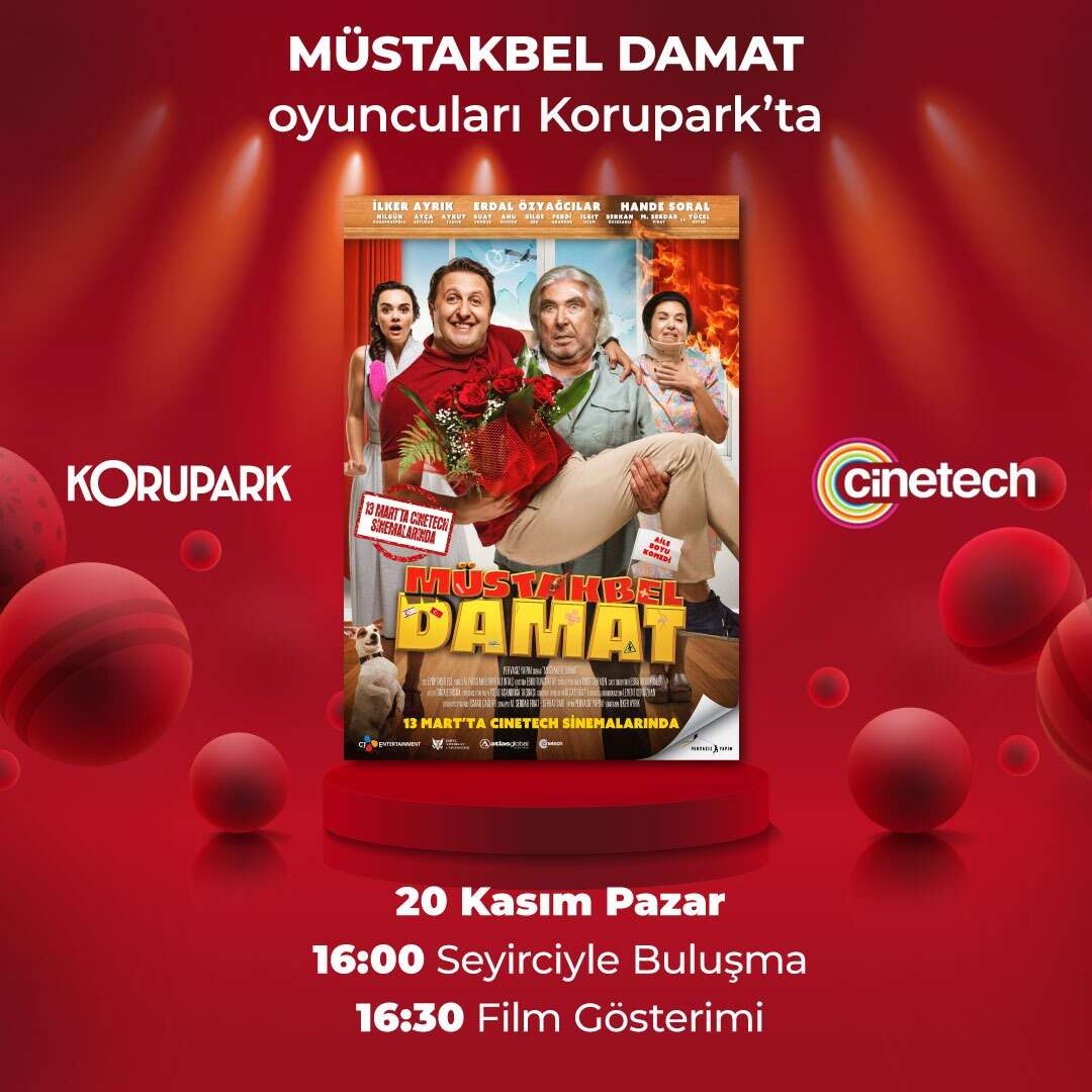 Müstakbel Damat filminin başrol oyuncuları Erdal Özyağcılar ve İlker Ayrık 20 Kasım Pazar günü saat 16.00'da Korupark Avm Atrium alanında seyirci ile buluşmanın ardından sinemaseverler 16:30’da KoruparkCinetech sinemalarında oyuncularla birlikte filmi izleyebilecekler.