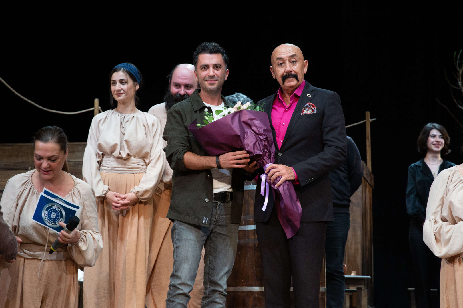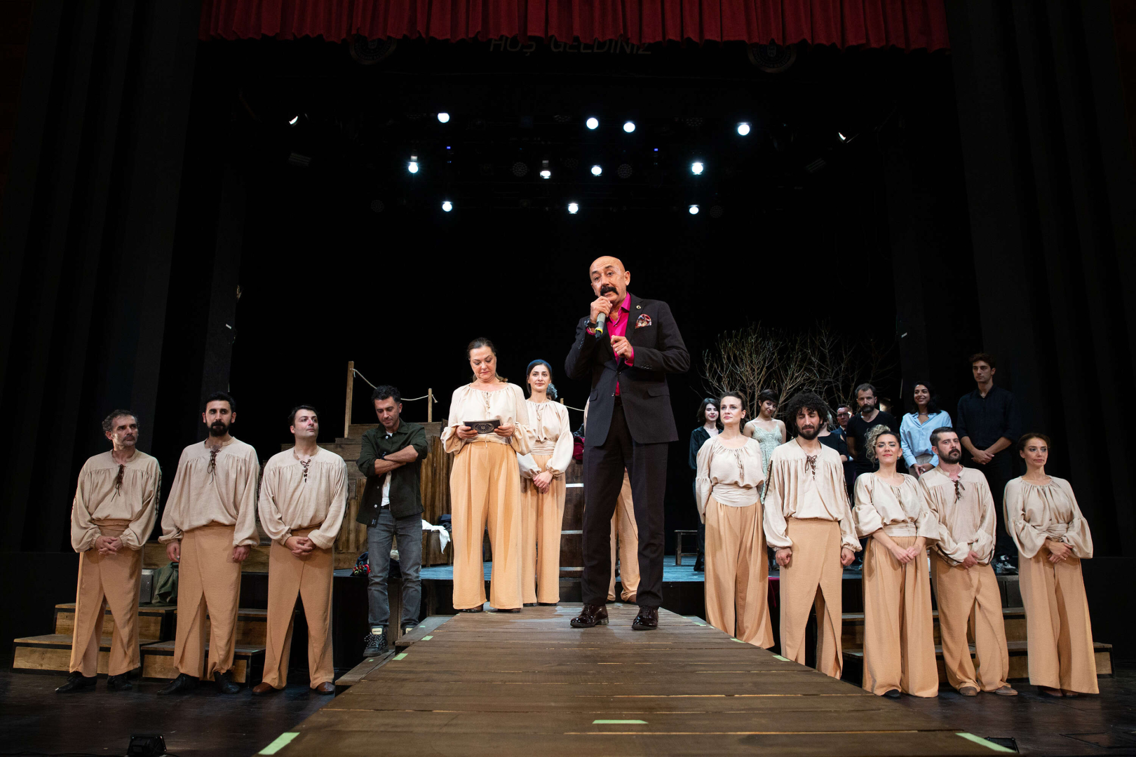 Tiyatrocuların performanslarıyla sahnede adeta devleştiği oyunu beğeniyle izleyen Bursa Büyükşehir Belediyesi Başkanvekili Fethi Yıldız, oyunun sonunda performansları nedeniyle tebrik ettiği tiyatroculara çiçek takdim etti.