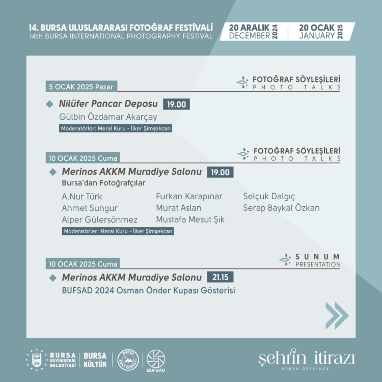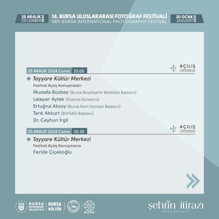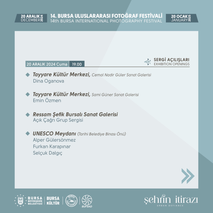 Bursa Büyükşehir Belediyesi’nin, Bursa Kent Konseyi ve BUFSAD işbirliğiyle bu yıl 20 Aralık-20 Ocak tarihleri arasında düzenleyeceği 14. Bursa Uluslararası Fotoğraf Festivali (Fotofest), bir kez daha fotoğraf tutkunlarını Bursa’da buluşturuyor. ‘Şehrin İtirazı’ temasıyla hazırlanan festival kapsamında 33 solo sergi, ulusal ve uluslararası katılımlı grup sergiler, eser sahiplerinin de katılımıyla fotoğraf tutkunlarıyla buluşacak.