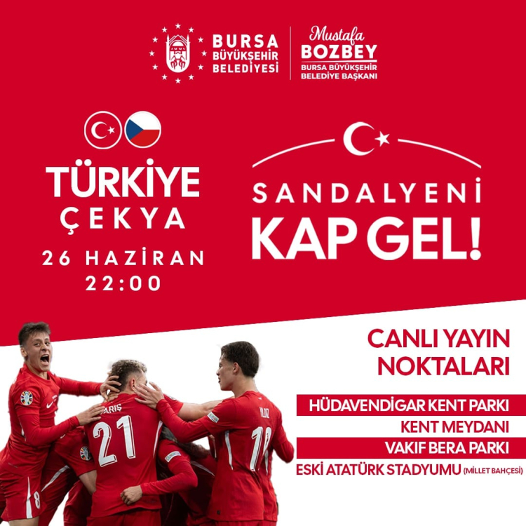 Bursa Büyükşehir Belediyesi, A Milli Futbol Takımımızın EURO 2024 Avrupa Şampiyonası’ndaki Çekya maçını tüm vatandaşların büyük bir coşku içerisinde izleyebilmesi için ‘Sandalyeni kap gel’ diyerek Hüdavendigar Kent Parkı, Kent Meydanı, Vakıf Bera Parkı ve Eski Atatürk Stadyumu’nda (Millet Bahçesi) dev ekranlar kuruyor.