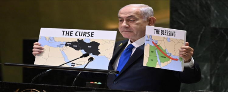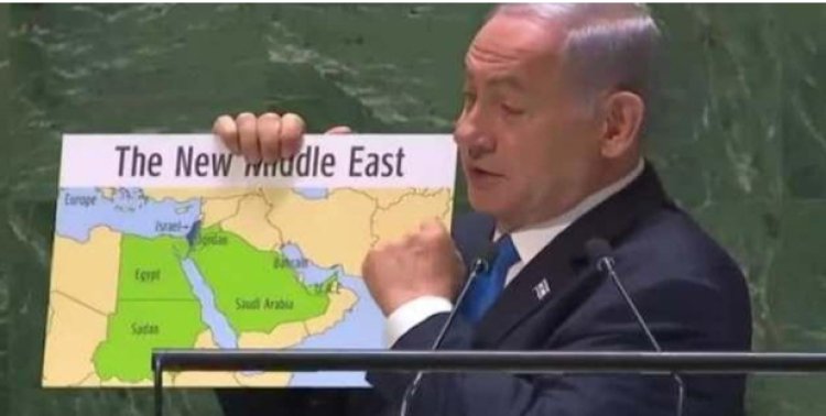 2 Eylül 2023 tarihinde katil ve soykırımcı Netanyahu’nun elinde 'Yeni Orta Doğu' olarak tanımladığı bölgenin haritasıyla BM Genel Kurulunda bir konuşma yaptı. Bu, Hamas'ın İsrail'e saldırı başlatmasından sadece iki hafta önceydi. Görüldüğü gibi Netanyahu'nun haritasında Gazze ve Batı Şeria yer almıyor. Zaten bunu önceden planlamışlar.