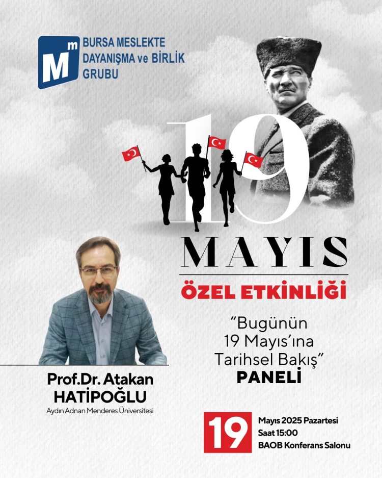 Peki bu süreçte nasıl bir yol izleyeceğiz? Tarihinde büyük atılımlar gerçekleştirmiş bir millet olarak bu yeni dönemde hem dış cephede hem iç cephede bize yol gösterecek olan şey Halide Edip ADIVAR’ın: “Fatihlerin, Yavuzların, Kanunilerin ülkesi İstiklâlsiz kalamaz.” Sözünde bahsedilen tarihimizdir. Tarihsel birikimimiz en büyük zenginliğimizdir. Önümüzdeki süreçleri çözümlemek için dersler çıkaracağımız zengin bir tarihe sahibiz. Dolayısıyla, bugünün 19 Mayısına tarihsel bir bakışın ufkumuzu aydınlatacağından şüphemiz yoktur. Tüm bunları göz önüne alarak tarihsel sorumluluklarını da yerine getirmek adına BSMMMO Meslekte Dayanışma ve Birlik Grubu 19 Mayıs’a özel bir, etkinlik düzenliyor. Uygarlık tarihimizin serüvenini yalın bir dille anlatan ve satış rekorları kıran “TÜRKLERİN UYGARLIK SERÜVENİ” kitabının yazarı Prof. Dr. Atakan HATİPOĞLU’nu 19 MAYIS 2025 Pazartesi günü saat: 15.00’de, BAOB konferans salonunda, Bugünün 19 Mayısına tarihsel bakış konulu konferansta Bursa halkıyla buluşturacak.