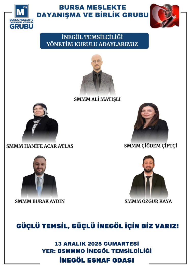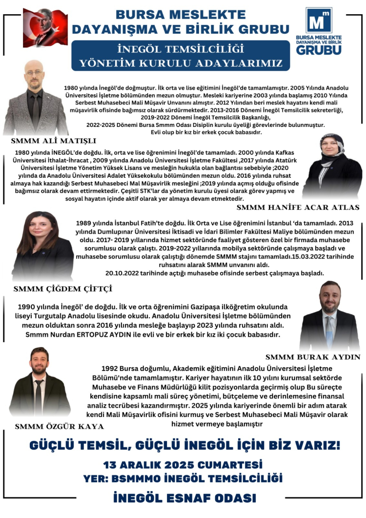 Gerçekle ilgisi olmayan projelerle değil, mevzuata uygun çalışma iradesiyle yola çıkan Meslekte Dayanışma ve Birlik Grubu’nun adayları Sayın Ali MATIŞLI’ya, Sayın Hanife ACAR ATLAS’a, Sayın Çiğdem ÇİFTÇİ’ye, Sayın Burak AYDIN’a ve Sayın Özgür KAYA’ya 13 Aralık Cumartesi günü yapılacak seçimlerde başarılar diliyorum.