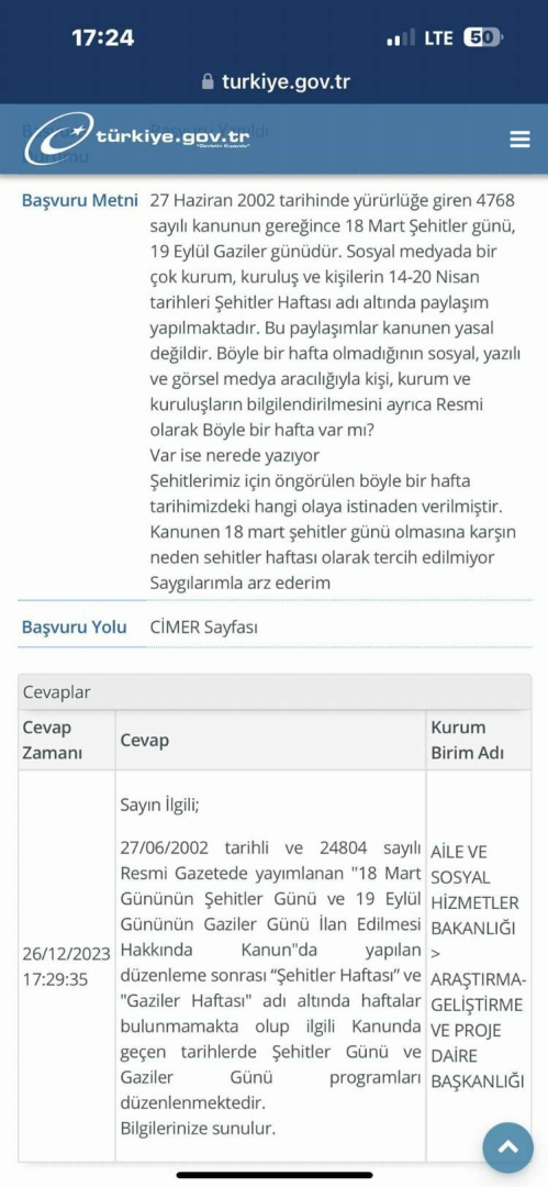“27- 06- 2002 tarihli ve 24804 sayılı Resmi Gazetede yayımlanan “18 Mart Gününün Şehitler Günü” ve “19 Eylül Gününün Gaziler Günü” ilan edilmesi hakkında kanunda yapılan düzenleme sonrası ”Şehitler Haftası ve “Gaziler Haftası” adı altında haftalar bulunmamakta olup ilgili kanunda geçen tarihlerde Şehitler Günü ve Gaziler Günü düzenlenmektedir.”