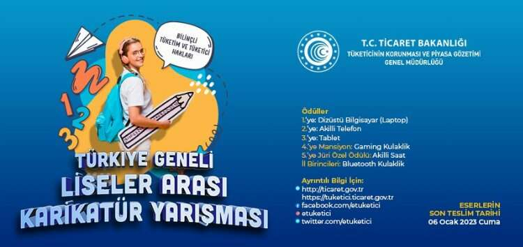 Tüketicinin Korunması ve Piyasa Gözetimi Genel Müdürlüğü'nce 2022-2023 Eğitim Öğretim yılı içerisinde “Bilinçli Tüketim ve Tüketici Hakları” konulu, ülke çapında resmi ve özel okulların, lise 9.10.11 ve 12’nci sınıf öğrencileri için karikatür yarışması düzenledi.