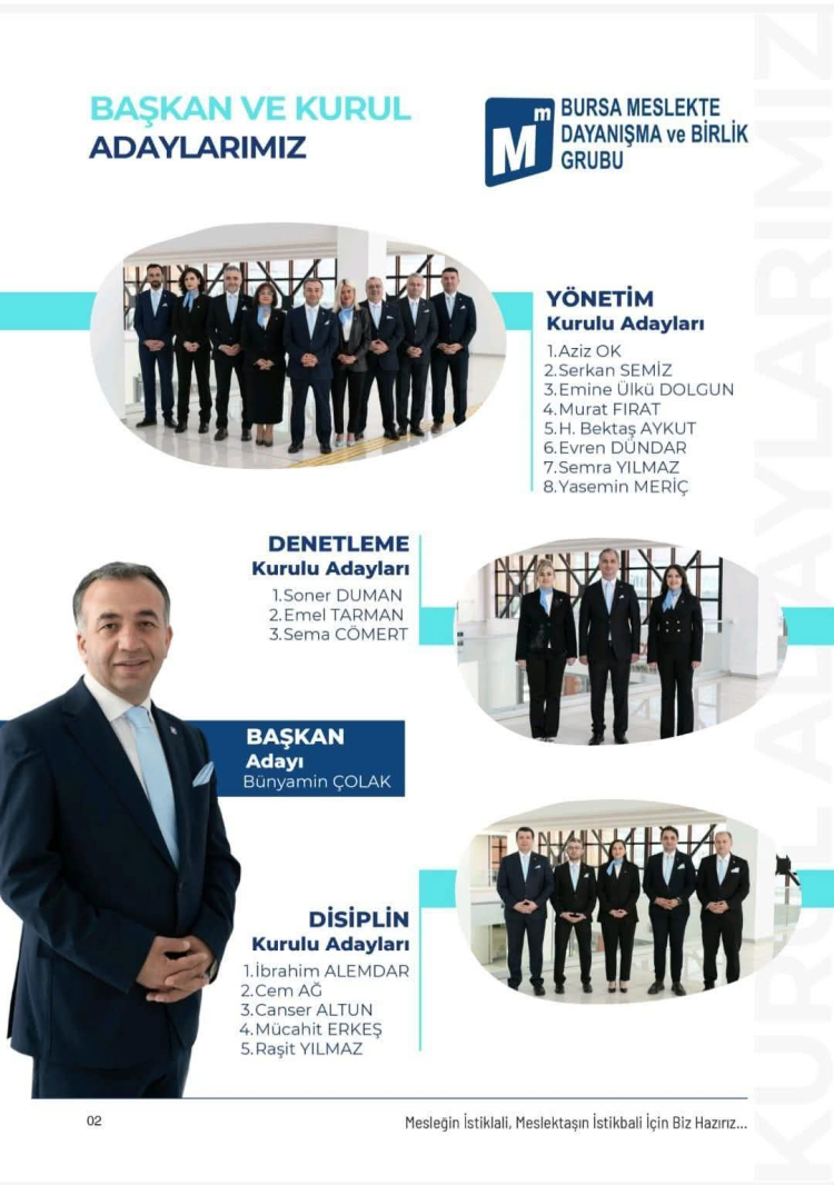 "Bursa Meslekte Dayanışma ve Birlik Grubu" adına halen Bursa Serbest Muhasebeci Mali Müşavirler Odası yönetim kurulu üyeliği devam eden, oda başkan adayı Bünyamin Çolak,