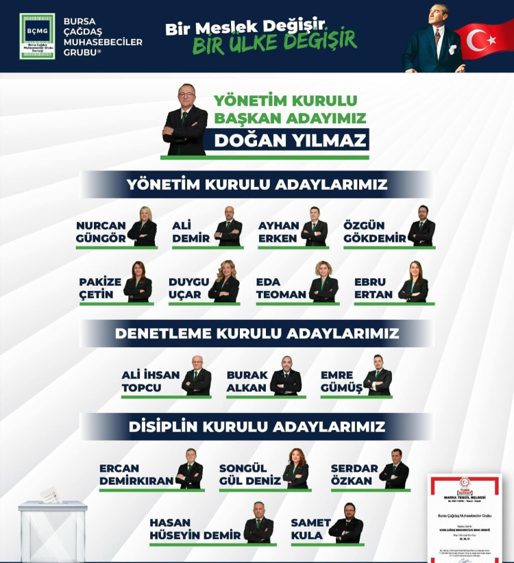 "Bursa Çağdaş Muhasebeciler Grubu Derneği" adına da daha önce Oda başkanlığı yapan, oda başkan adayı Doğan Yılmaz seçimlere katılacak.